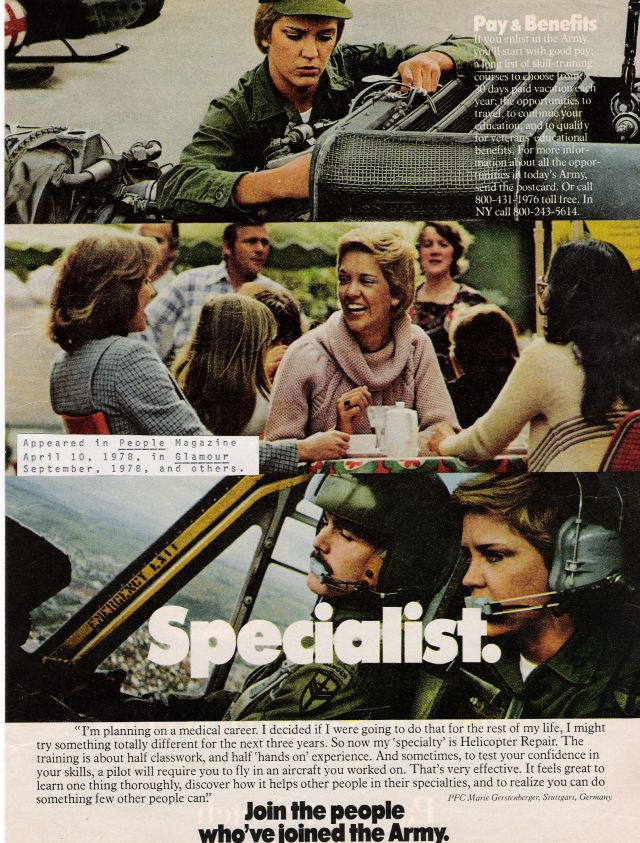 Duane F. Gerstenberger appeared in a recruiting ad for the Army, in 1983, in JAMA and other publications, and his daughter, Mauri (Marie) G. Mays, appeared even earlier in 1978, in People, Glamour, and others. See both of them below: